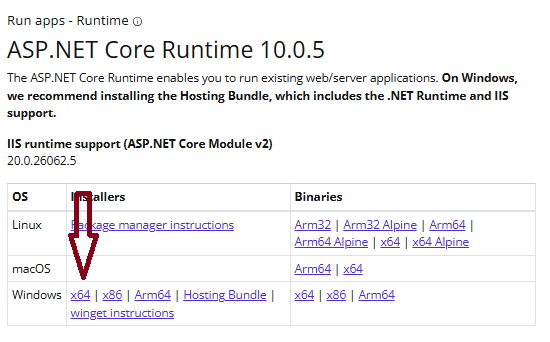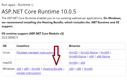 - Download Hosting Bundle for ASP NET Core Runtime 10.0.5, depending on your OS and processor architecture. For example